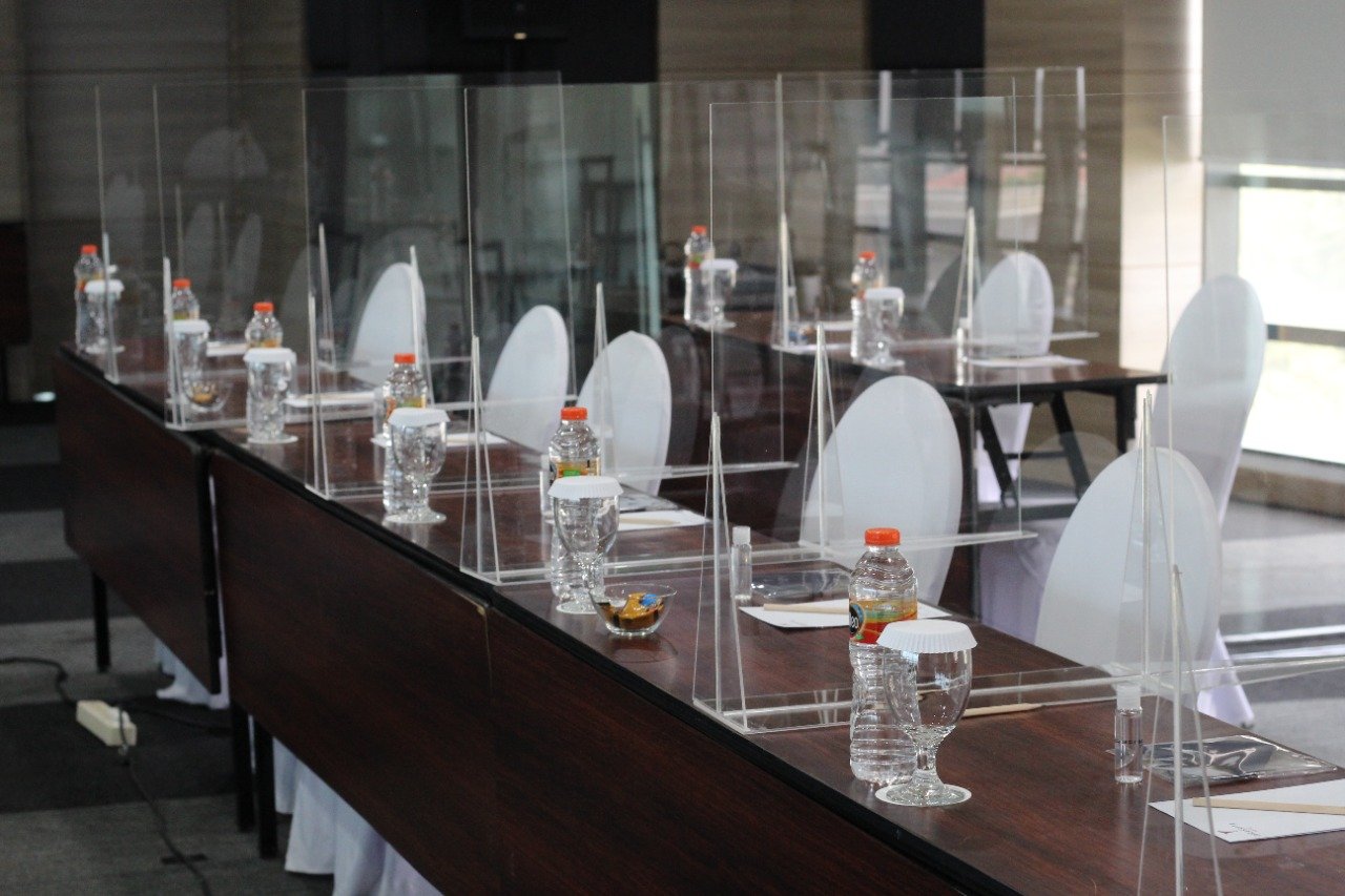 Tak kalah menarik, SMART Meeting promo with Physical Distancing menjadi solusi tepat bagi mereka yang membutuhkan ruangan meeting tatap muka dengan standar protokol COVID-19 ketat. Setiap peserta meeting wajib menggunakan masker, diukur suhu tubuh, menggunakan hand sanitizer, serta physical distancing dengan jarak 1 meter antar-kursi. Selain itu, setiap meja dipasang acrylic divider untuk proteksi aman, dan tiap meja juga akan diberikan benefit tambahan berupa masker kain serta hand sanitizer. Masing-masing hygiene set tersebut dapat dimiliki oleh para peserta meeting. Seluruh rangkaian meeting akan dilayani oleh staf hotel yang telah melewati tahap pemeriksaan kesehatan dengan hasil non-reaktif. Dalam melaksanakan tugasnya, staf hotel akan dilengkapi dengan APD (Alat Pelindung Diri) lengkap, seperti masker, hand glove, dan face shield.